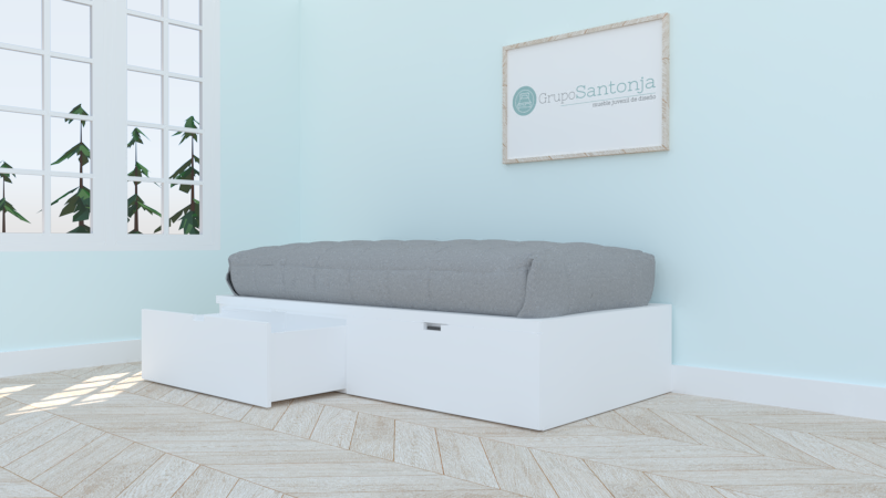 Cama de 90 x 190, y 2 cajones con guías de 34 cm de alto.