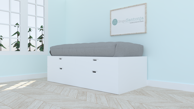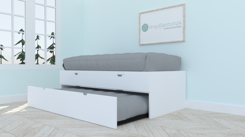 Cama de 90 x 190, con 2 cajones con guías de 21 cm de alto, para somier inferior de arrastre de 90 x 190 con capacidad para colchón de 18 cm de alto.