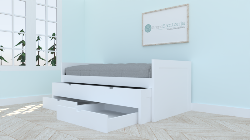 Cama de 90 x 190,y de 90 x 180 con capacidad para un colchón de 16 cm de alto, y 2 cajones con guías de 18 cm de alto.
