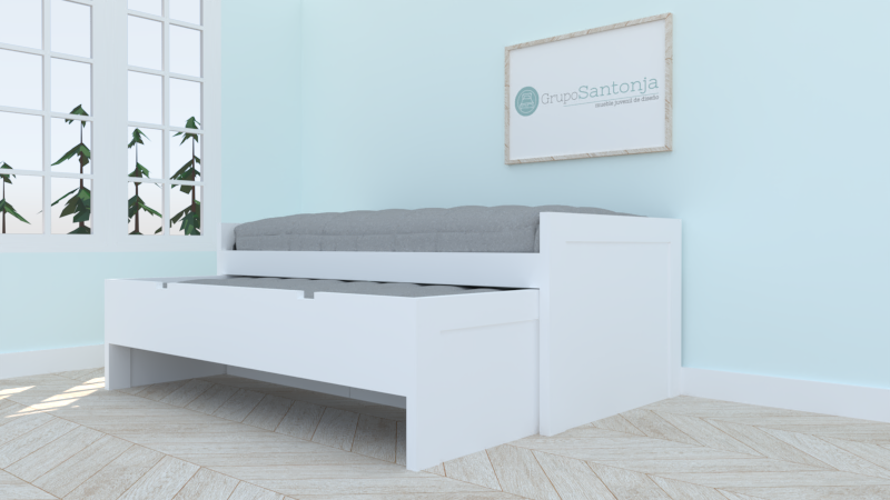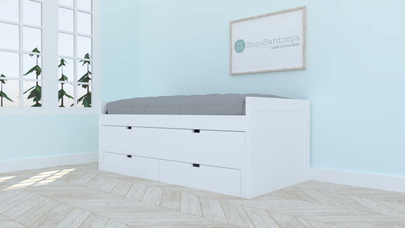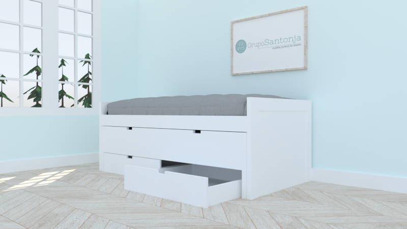 Cama de 90 x 190, y de 90 x 180 con capacidad para un colchón de 22 cm de alto, y 2 cajones con guías de 21 cm de alto.