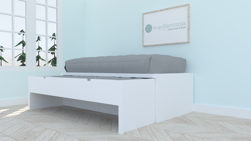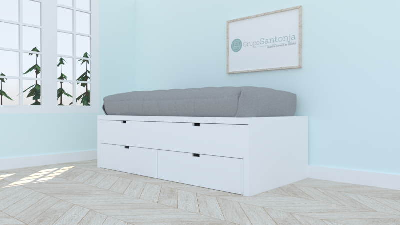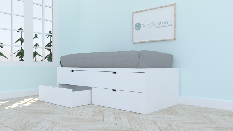 Cama de 90 x 190, y de 90 x 190 con capacidad para colchón de 20 cm de alto, y 2 cajones con ruedas de 29 cm de alto.