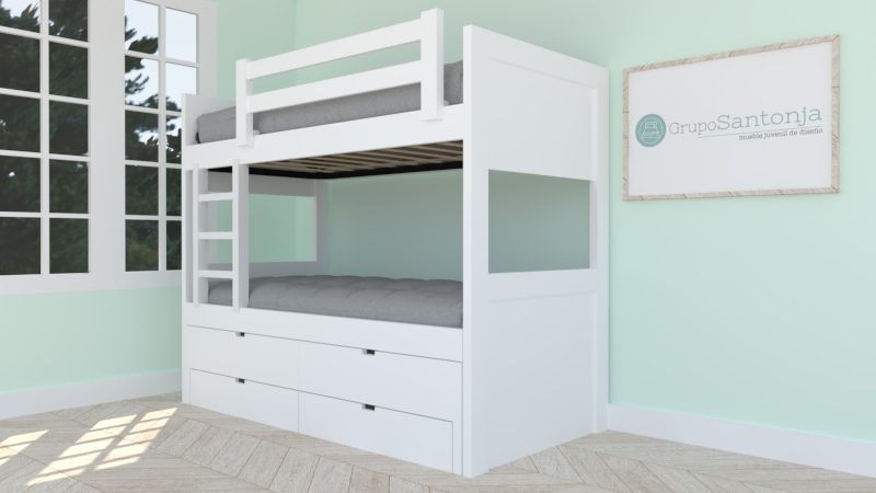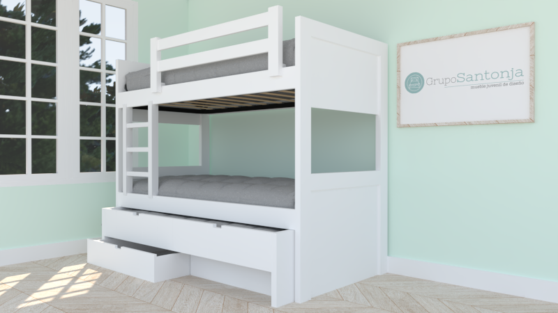 Dos camas de 90 x 190, e inferior de 90 x 180 con capacidad para colchón de 16 cm de alto, y 2 cajones con guías de 18 cm de alto.
