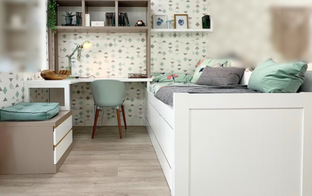 El escritorio es de rincón y se puede colocar con un costado a la cama o con un costado al suelo.